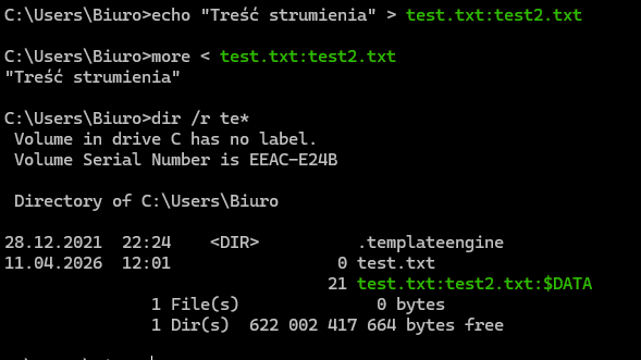 Alternatywne Strumienie Danych (ADS) w NTFS to mechanizm systemu plików Windows (NTFS od NT 3.1), umożliwiający dołączanie ukrytych strumieni danych do plików bez zmiany ich rozmiaru czy widoczności w Explorerze. Główny strumień to standardowe dane…