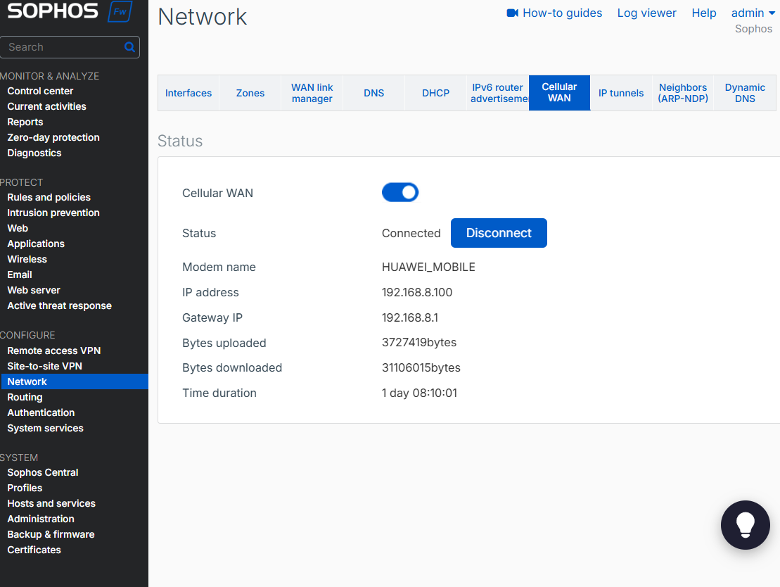 Skonfigurowałem w Sophos Firewall modem LTE oraz dodatkowe – backupowe łącze. System automatycznie wykrywa niedostępność łącza głównego z Play (dawne UPC) i przełącza cały ruch na łącze backupowe (LTE).