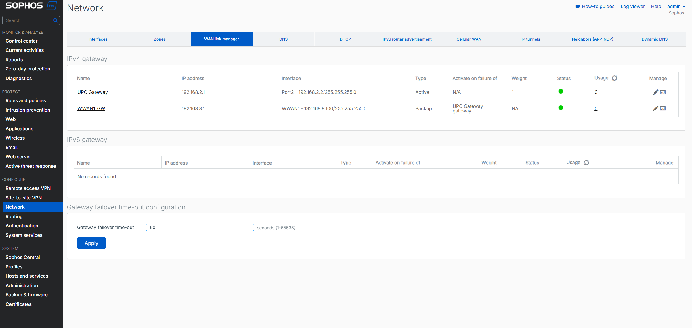 WAN link manager w Sophos Firewall to moduł zarządzający połączeniami WAN, pozwalający na profesjonalne wdrożenie redundancji (failover) oraz równoważenia obciążenia (load balancing) dla wielu łączy internetowych. Pozwala przypisać każde z dostępnych łączy jako „Active” (aktywne, główne) lub „Backup” (zapasowe), automatycznie sterując przełączaniem ruchu w przypadku awarii głównego połączenia.