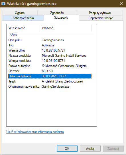 C:\Program Files\WindowsApps\Microsoft.GamingServices_31.105.23001.0_x64__8wekyb3d8bbwe\gamingservices.exe to plik wykonywalny związany z usługą Microsoft Gaming Services. Jest to komponent systemu Windows, który wspiera funkcje związane z grami, takie jak uruchamianie i zarządzanie tytułami z Microsoft Store, Xbox i Game Pass. Standardowo, ta usługa jest potrzebna, jeśli korzystasz z gier Microsoft, Xbox lub subskrypcji Game Pass. Jest to część ekosystemu Microsoft Gaming, zapewniająca płynne działanie gier, ich aktualizacje i zarządzanie. Możesz to rozpoznać jako oficjalny komponent systemu Windows, nawet jeśli nie korzystasz aktywnie z gier – jest on włączany automatycznie i działa w tle, aby wspierać funkcje gracza i systemu gamingowego. Jeśli nie używasz gier od Microsoft, można próbować ręcznie wyłączyć tę usługę, ale odinstalowanie nie jest zalecane, bo może powodować problemy z grami w przyszłości.