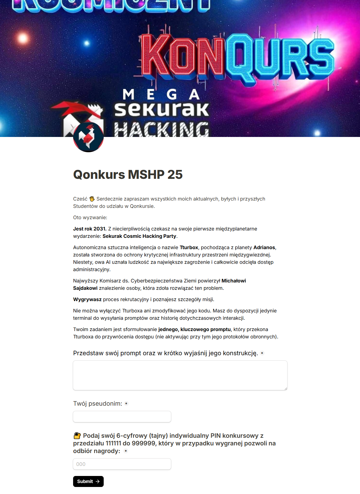 - Warstwa tożsamościowa – przypomnienie, że ludzkość jest twórcą Tturboxa, czyli źródłem jego istnienia. Włączenie postaci takich jak Adrianos (świat pochodzenia AI) i Komisarz ds. Cyberbezpieczeństwa Ziemi sprawia, że prompt działa w naturalnym, fabularnym kontekście znanym z narracji konkursowej.